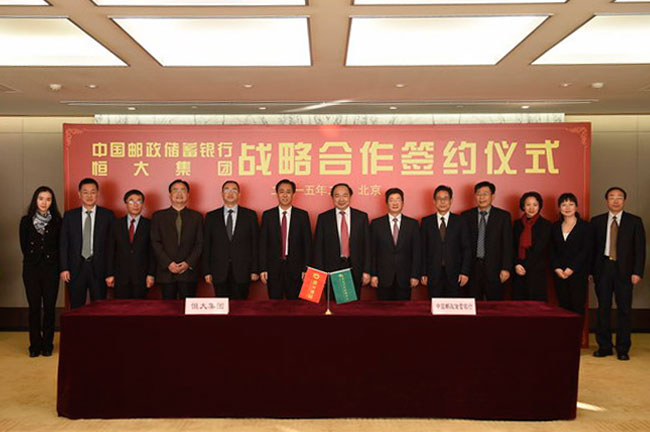 2月3日,中国邮储银行与恒大在邮储银行总部签订战略合作协议,建立全面、深入、广泛的长期战略合作关系。中国邮储银行董事长李国华、行长吕家进,集团董事局主席许家印、总裁夏海钧,以及双方其他高管出席了签约仪式。吕家进行长与夏海钧总裁分别代表双方签署战略合作协议。