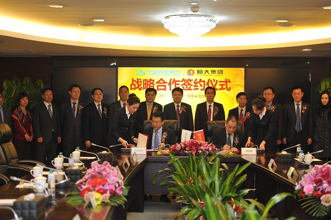 2月12日,中国民生银行与恒大在民生银行总部签订战略合作协议,双方建立长期、建设性的战略合作关系。中国民生银行董事长洪崎,恒大集团董事局主席许家印,集团副主席、总裁夏海钧,以及双方所有相关高管出席签约仪式。民生银行党委委员林治洪、夏海钧总裁分别代表双方签署战略合作协议。