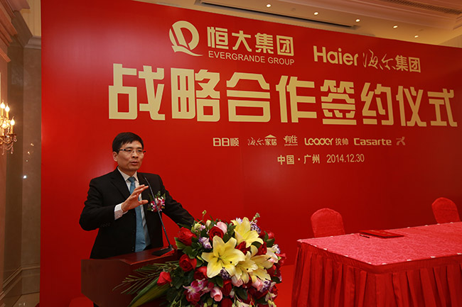 12月30日,恒大集团、海尔集团战略合作签约仪式在广州举行,双方在材料设备提供、装饰工程施工、金融服务支持等三大领域达成战略合作。集团董事局副主席、总裁夏海钧博士,海尔集团轮值总裁、董事局副主席周云杰出席签约仪式并致辞。