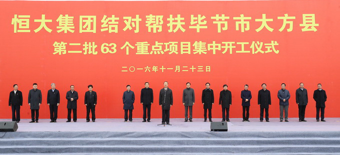 在恒大集团帮扶大方县第二批63个重点项目开工仪式上,贵州省省长孙志刚称赞说,恒大为包括民营企业在内的全国各类企业参与脱贫攻坚、促进共同富裕,创造了宝贵的经验,树立了光辉的榜样,在我国扶贫史上写下了浓墨重彩的一笔。