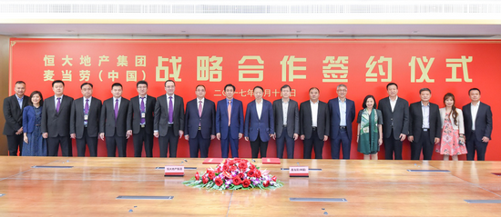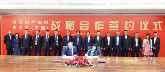 8月14日,恒大地产集团与麦当劳(中国)签订长期战略合作协议,恒大集团董事局主席许家印,恒大集团董事局副主席、总裁夏海钧,恒大集团常务副总裁兼恒大地产集团总裁时守明, 恒大集团常务副总裁甄立涛;中国中信集团董事长常振明,中信集团总经理助理兼中信证券董事长张佑君,中信银行行长孙德顺,中信资本董事长兼麦当劳中国董事会主席张懿宸等出席了签约仪式。