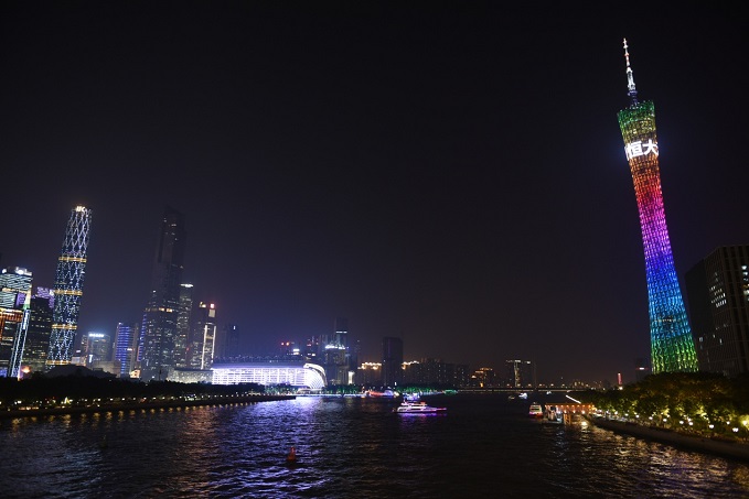 10月23日晚,广州市政府在广州塔亮灯,再次“热烈祝贺广州恒大淘宝足球队中超七连冠”。