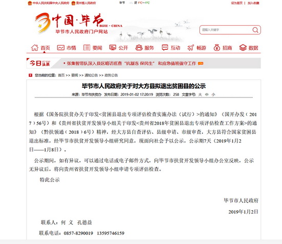 2019年1月2日,毕节市人民政府关于对大方县拟退出贫困县的公示。