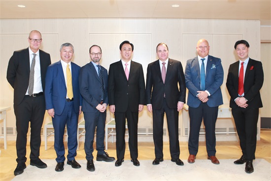 瑞典首相斯特凡·勒文(右三)见证签约并合影留念