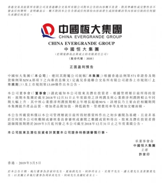 恒大步入高质量增长轨道:2018年核心净利同比增90%