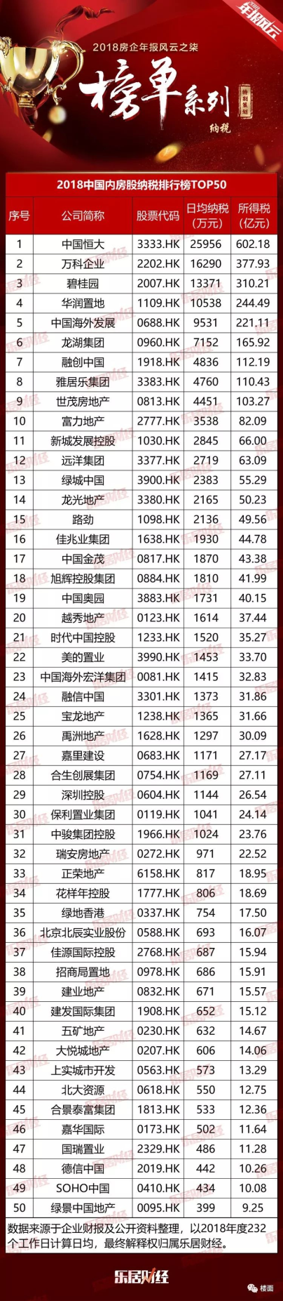 中国恒大凭借602.18亿的所得税排名第一,成为内房股的所得税“纳税王”,日均纳税2.6亿;万科、碧桂园所得税分别为377.93亿和310.21亿,位列第二和第三;华润置地、中国海外发展、龙湖集团、融创中国、雅居乐集团、世茂房地产和富力集团,分别排第四至第十名。