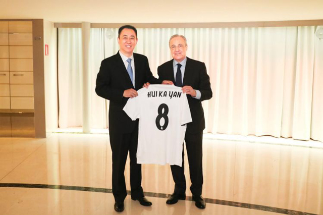 皇马主席弗洛伦蒂诺向许家印赠送礼物