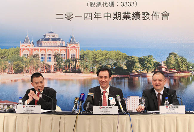 恒大2014中期业绩香港发布会现场,中为董事局主席许家印,右为董事局副主席、总裁夏海钧,左为首席财务官兼执行董事谢惠华