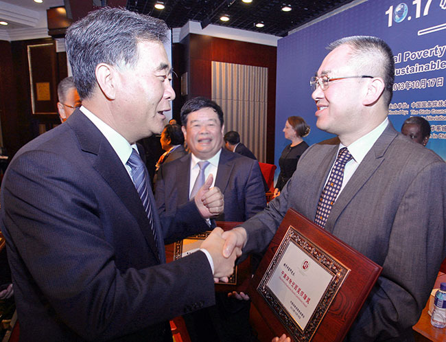 10月16日,中国扶贫慈善领域政府最高奖——第四届“中国消除贫困奖”在京揭晓。恒大集团董事局主席许家印、 “杂交水稻之父”袁隆平、联合国世界粮食计划署等10位个人和机构获奖。次日上午,“中国消除贫困奖”颁奖仪式在北京国家会议中心隆重举行,恒大集团董事局副主席、总裁夏海钧代表许主席领奖。中央政治局委员、国务院副总理汪洋出席颁奖仪式并为获奖者颁奖,他对许主席及恒大集团多年来在扶贫济困事业上的突出贡献表示了肯定与赞赏。