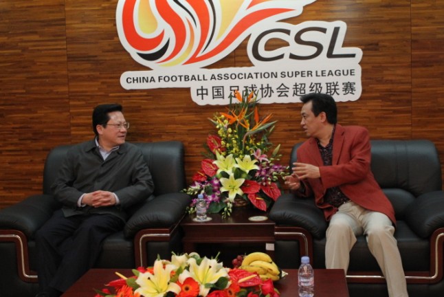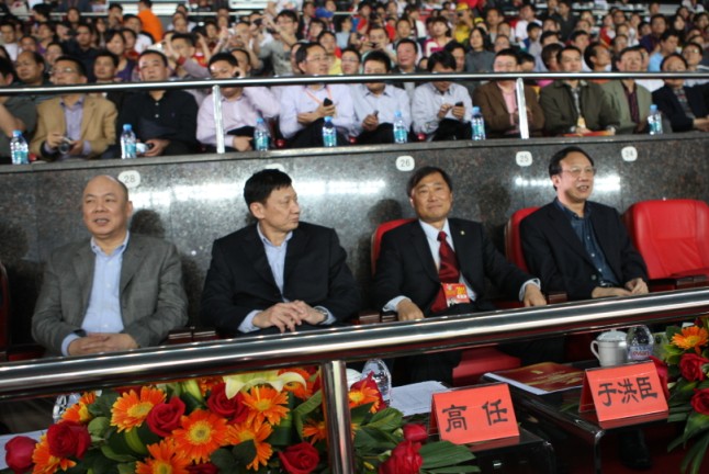 李钢副主席陪同副省长林木声(右一)、中国足协副主席于洪臣(右二)、公安部三局副局长高任(右三)观看开幕式和揭幕战
