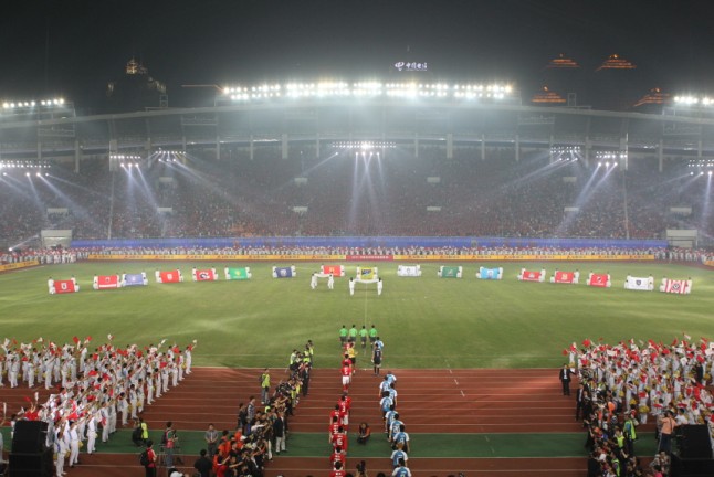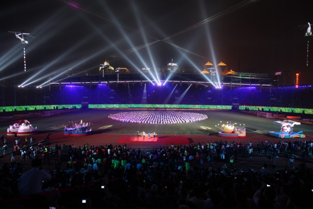 4月2日晚,万众瞩目的中超联赛开幕式暨揭幕战在广州天河体育中心盛大举行。耗资5000万、亚运团队倾力打造的开幕式让整个现场变成欢腾的海洋,高潮迭起的高科技演出、1900名少林武僧的方阵表演、8大明星的倾情演绎、8架特制直升机的缓缓升起,将现场气氛不断推向新的高潮。