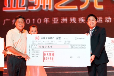 9月3日,时值亚残运会倒计时100天,主题为“亚洲之光·生命之光”的慈善晚会在广州天河体育馆隆重举行。恒大地产集团作为一向关注和支持公益慈善事业的大型企业集团,在晚会现场捐赠300万元,全力支持广州亚残运会,再次用实际行动突显出企业热心支持慈善公益事业的战略发展高度。据悉,恒大所捐赠金额为当晚企业中捐赠数额最高的。