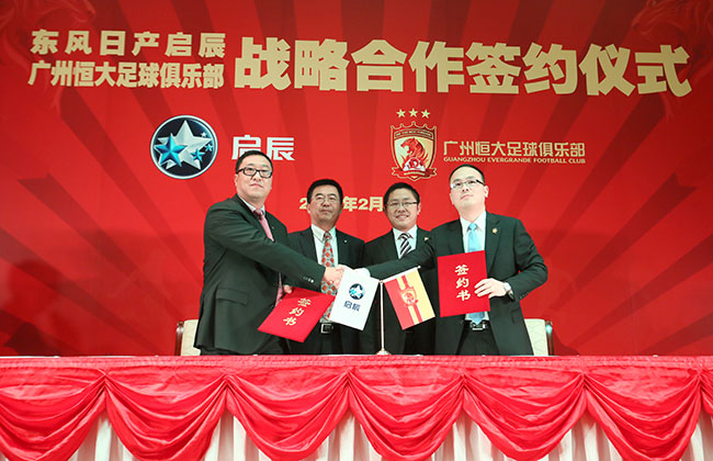2月17日,东风日产启辰与广州恒大足球俱乐部宣布正式签署战略合作协议——2014赛季恒大球衣胸前广告将印有“东风日产”和“启辰”字样。