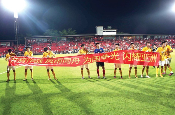 广州恒大足球队球员在泰国客场拉横幅庆祝胜利