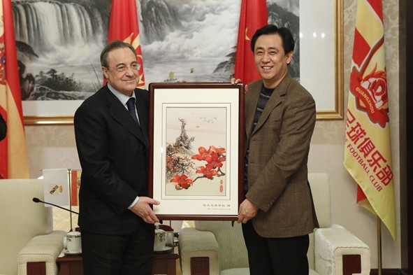 最后,宾主双方还交换礼物。许主席赠送给弗洛伦蒂诺的是一幅绣有五羊雕像和木棉花的广绣,寓意着广州足球红红火火。弗洛伦蒂诺主席则向许主席回赠了印有许家印名字的皇马8号的球衣。会晤结束后,弗洛伦蒂诺主席参加了许主席专门为他准备的欢迎晚宴。