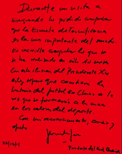 在访问恒大期间,我亲身验证了恒大皇马足球学校是在全球范围最重要的一间足球学校。更加难以置信的是它仅在短短的10个月就完成了。我坚信许家印 主席对足球事业的极大热情,必将会改变中国足球的历史,并培养出更多优秀的真正理解体育价值的孩子们。