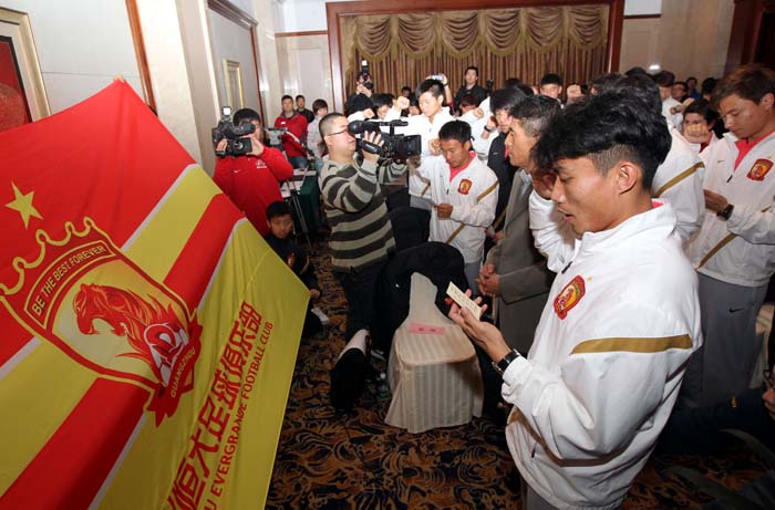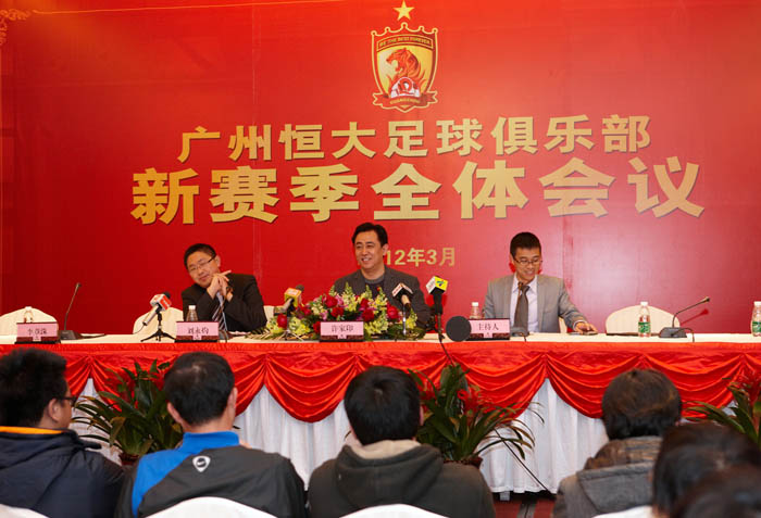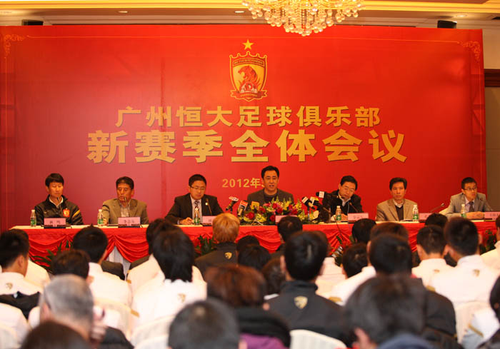 3月1日,广州恒大足球俱乐部新赛季全体会议在广州恒大酒店顺利举行,恒大集团董事局主席许家印教授、广州市体育局局长罗京军、广州市体育局副局长孔茂胜、恒大集团副总裁兼广州恒大足球俱乐部董事长刘永灼、恒大集团副总裁兼品牌中心总经理柯鹏、广州恒大足球俱乐部全体教练员和运动员以及来自全国的一百多名主流媒体记者出席会议??屡舾弊懿弥鞒至吮敬位嵋?。