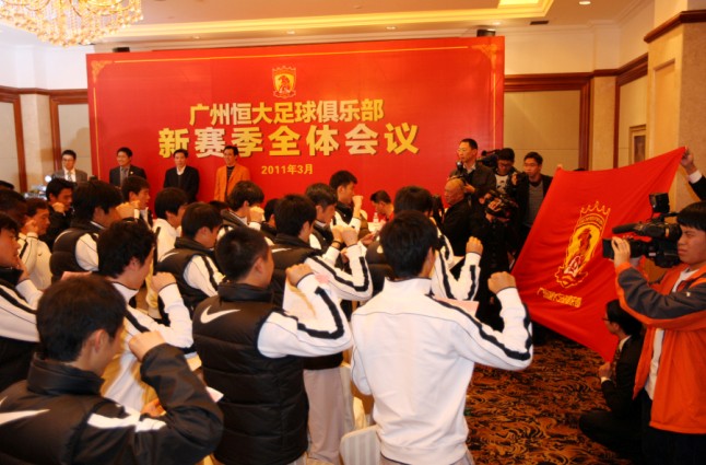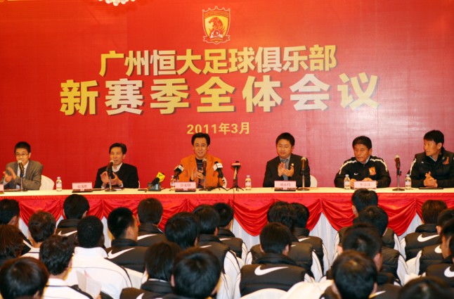 3月18日,广州恒大足球俱乐部新赛季全体会议在广州恒大酒店顺利举行,集团董事局主席许家印教授、广州市体育局副局长孔茂胜、集团副总裁兼广州恒大足球俱乐部董事长刘永灼、广州恒大足球俱乐部全体教练员和运动员出席会议。会议宣布了《关于同意<广州恒大足球俱乐部2011赛季联赛奖金方案请示>的批复》、《广州恒大足球队“五必须、五不准、五开除”管理规定》等重要文件。会议期间,广州恒大足球俱乐部全体教练员和运动员进行了赛前誓师活动。